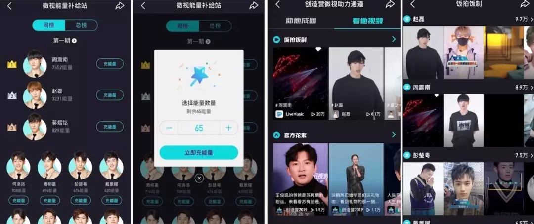 今年4月的《创造营2019》还推出了“创造营助力”、“能量补给站”、“饭拍饭制”等玩法,其中“创造营助力”鼓励用户拍摄助力视频并发送给好友,为喜欢的选手争取更多投票。虽然助力视频无法成为社区内的UGC,但发送给好友能起到拉新效果。“能量补给站”主要目的是促进用户在APP内的活跃,用户在活动页面完成签到、分享视频、拍视频等任务均可获得“微能量”,用于为喜爱的学员充能量,而每周能量值前三的学员将获得节目专属 60 秒、微视站内闪屏等额外展示机会。“饭拍饭制”则是对各个选手在微视的相关内容进行整合,用户也可以在选手的话题里上传视频,话题播放量第一的学员将获得微视站内外资源展示等资源。