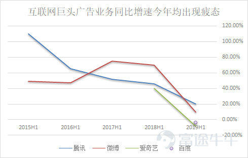 今年上半年腾讯的广告业务收入从2018H1的同比增长45.57%迅速下滑到20.11%;作为娱乐扛把子的微博也是从69.54%的同比增速直接掉到9.91%;而爱奇艺和百度军均出现下滑,下降幅度分别为8.62%和3.50%。