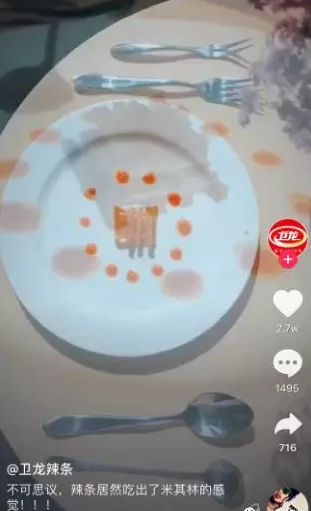 比如:卫龙辣条也入驻了抖音,目前只发了两条内容,相对火的内容是:辣条吃出了米其林的感觉。